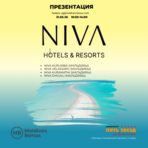 Niva Hotels & Resorts — новый lifestyle-бренд мальдивской компании VERSA Hospitality (ранее Universal Resorts), которая более 50 лет назад основала туризм на архипелаге, открыв в 1972 году первый курорт Kurumba. Название Niva, объединяющее смыслы «наполнять» (nourish) и «жизнь» (viva), отражает философию бренда: ценность искренних эмоций выше статуса. Портфолио включает шесть курортов, среди которых легендарные Kurumba, Velassaru и Kuramathi на Мальдивах. Совместно с Представителем компании в России и СНГ Яной Юмашевой мы проводим эксклюзивную презентацию отелей в кинотеатре 5* (Смоленский пассаж). В программе: самые свежие новости курортов, живое общение с представителями нашей компании и отеля, а также возможность по-настоящему вдохновиться и окунуться в профессиональный мир Мальдив. По завершении всех участников ждет фуршет-ланч и важное общение в неформальной атмосфере.