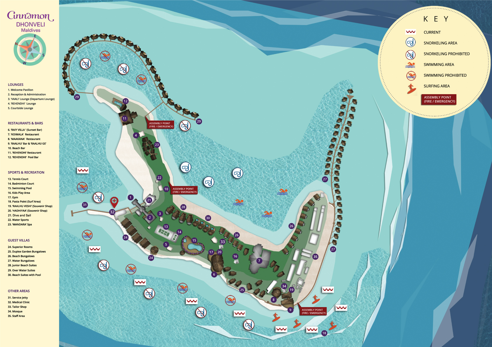 номера расположены в лагуне на сваях над водой, состоят из спальни, ванной комнаты, террасы со спуском в океан.
