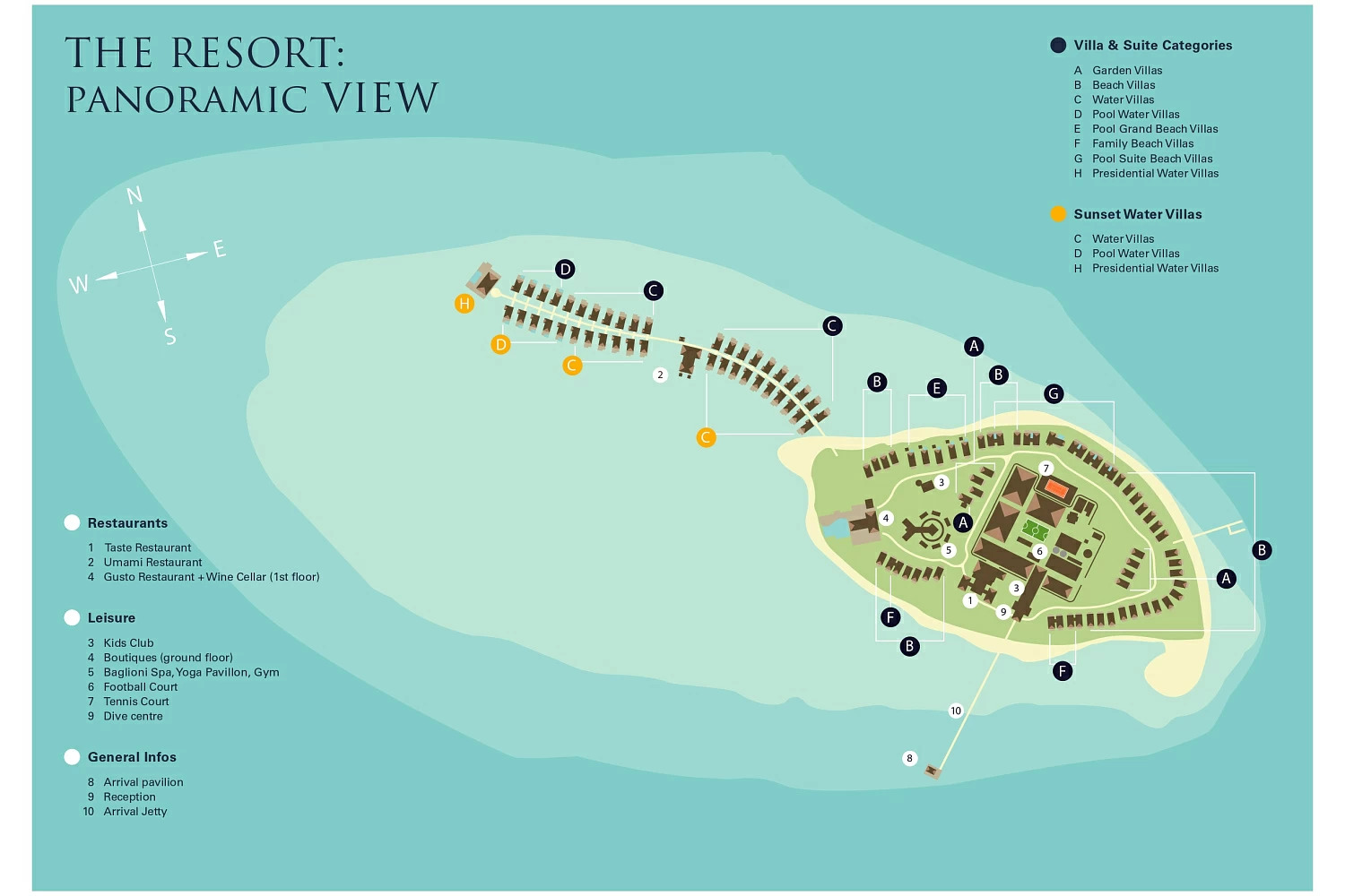 К широкому выбору гостей, бунгало, вписанные в тропический сад, береговые виллы с персональным пляжем, водные виллы с панорамным видом и спуском в океан, водные бунгало с бассейном, большие прибрежные виллы с собственным бассейном или двухуровневые домики на воде с бассейном, джакузи и зоной отдыха под открытым лазурным небом Мальдив.