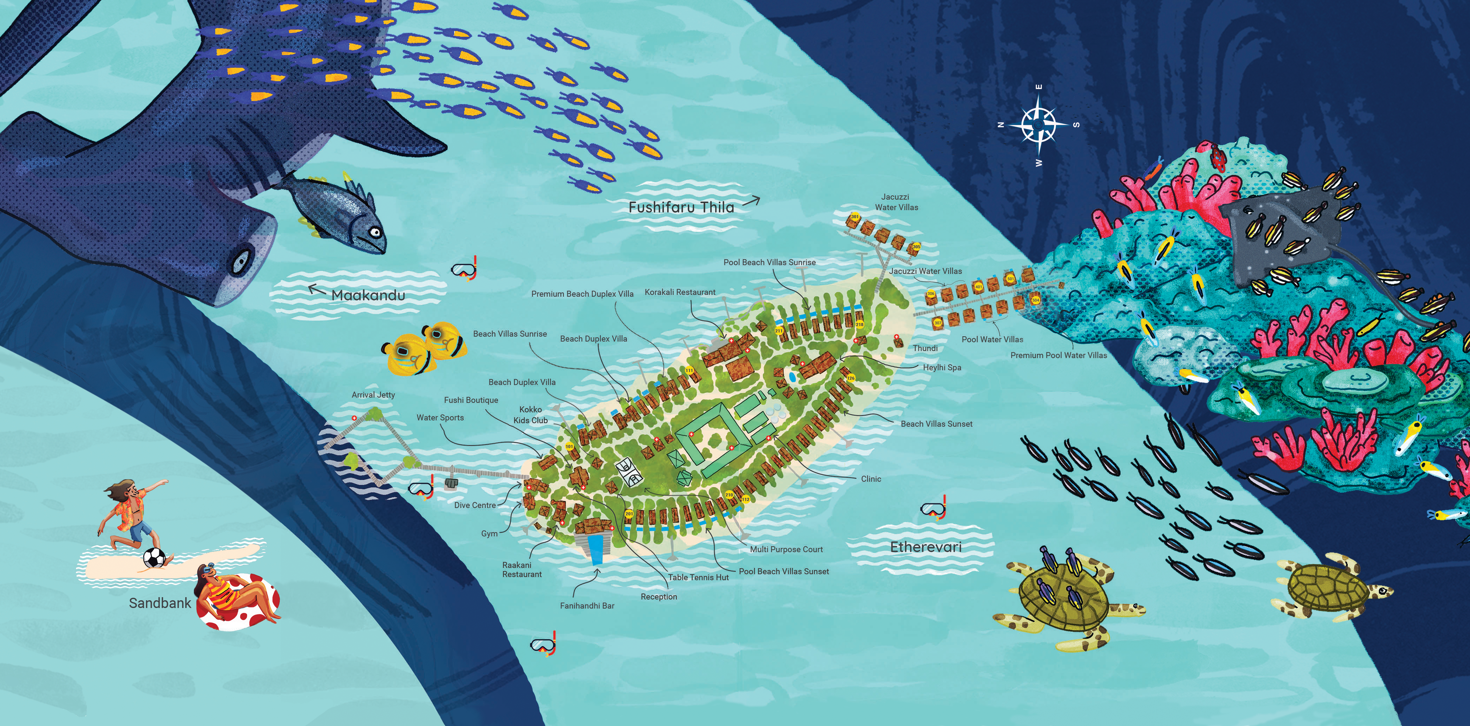 Отель Fushifaru Maldives отличается удачным расположением между двумя каналами, один из которых – национальный морской заповедник, в пределах которого, находятся как минимум три популярных дайв-сайта