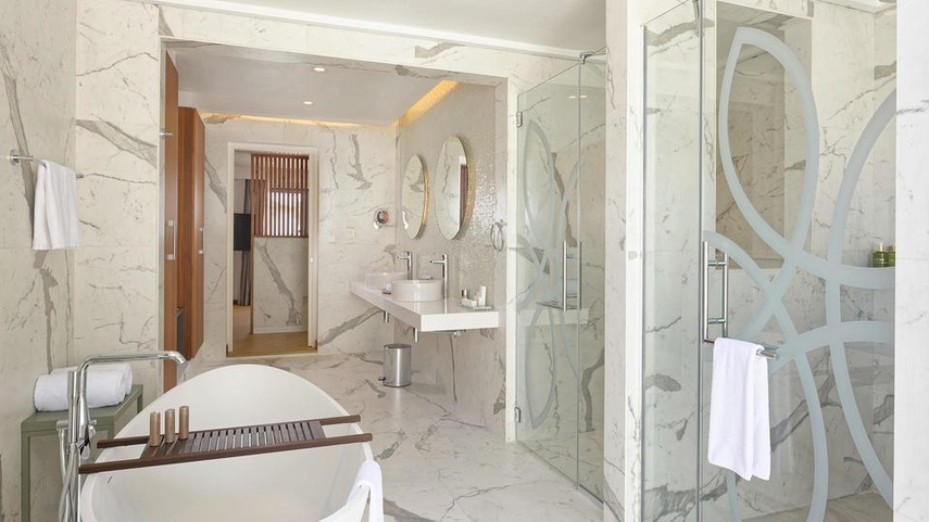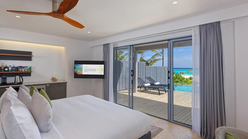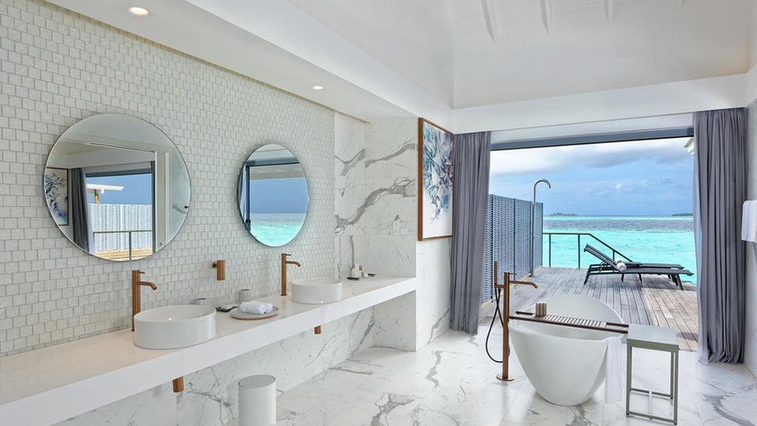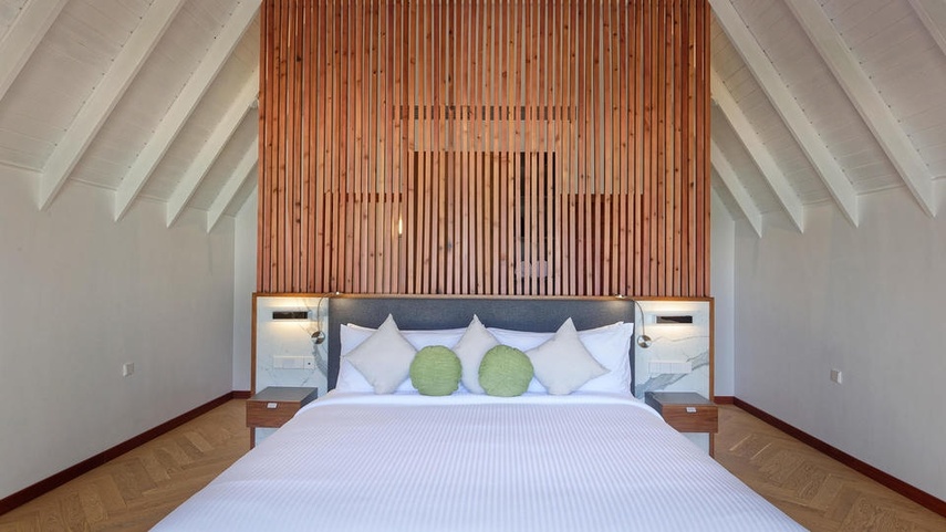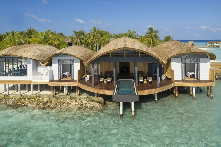 В отеле 5 категорий размещения: пляжная вилла на берегу с террасой и видом на море, водные бунгало с панорамным видом на океан, береговые и водные виллы с персональным бассейном и двухэтажные виллы с бассейном для больших семей.
