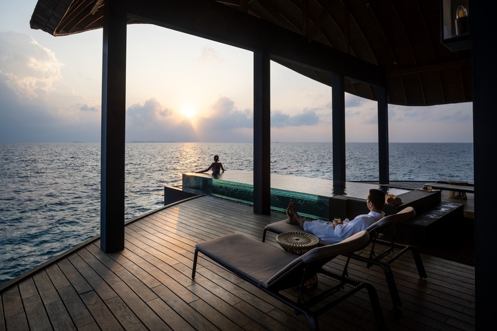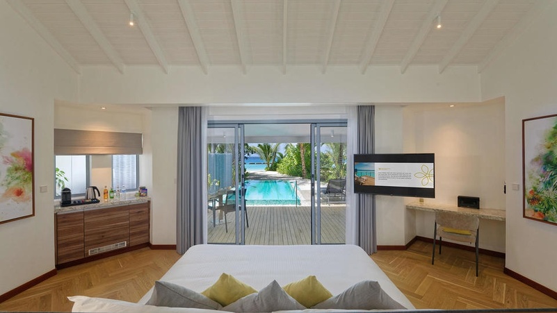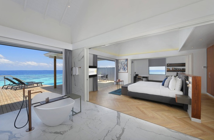 В отеле 5 категорий размещения: пляжная вилла на берегу с террасой и видом на море, водные бунгало с панорамным видом на океан, береговые и водные виллы с персональным бассейном и двухэтажные виллы с бассейном для больших семей.