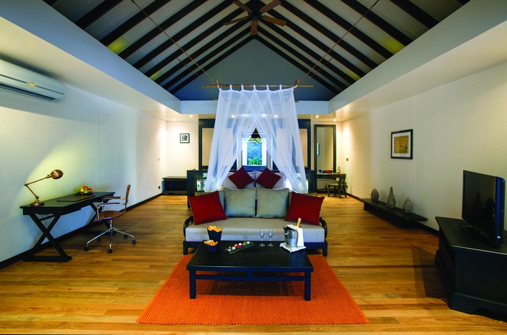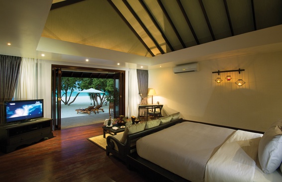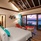 Water villa терраса со спуском в воду, спальня с кроватью queen-size, гардеробная, ванная комната с ванной и душем. Расположены на сваях над водой.