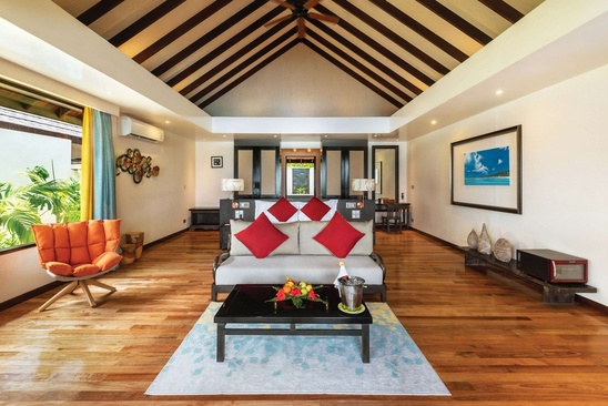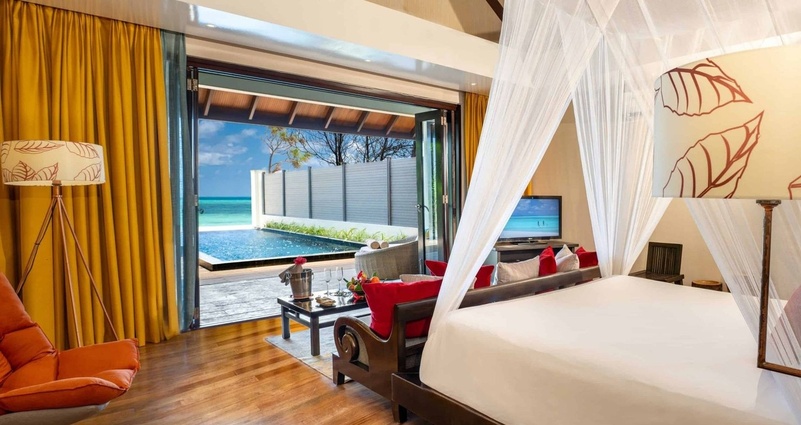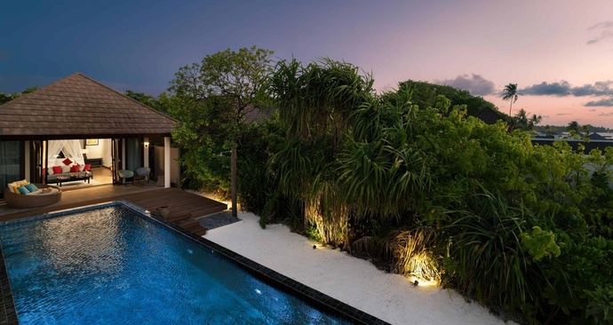 Ощутите идеальное сочетание островной привлекательности и современных удобств в наших уединенных виллах с видом на море на Мальдивах. Это островное уединение предлагает современные интерьеры и частные открытые пространства с бассейном. Пусть все заботы улетучатся, когда вы будете наслаждаться обширным видом на Индийский океан, окруженный пышной зеленью, с прямым выходом на пляж. Площадь номера - 146 м2. Площадь бассейна 30 м2.