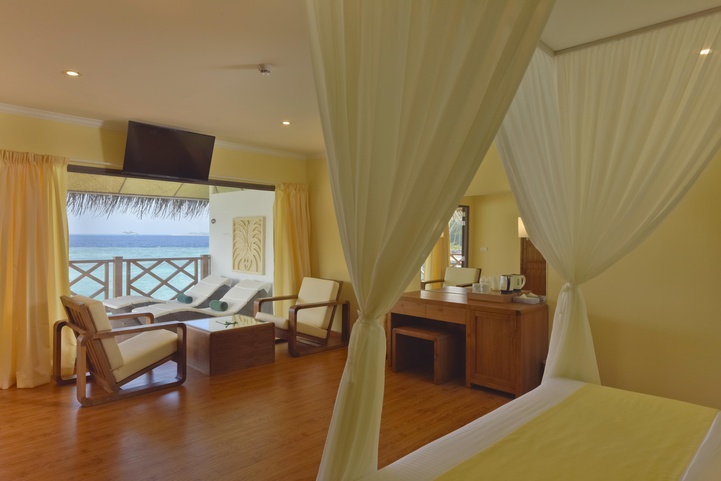 водные виллы. Состоят из спальни с кроватью king bed, ванной комнаты с ванной и душем и отдельным тропическим душем на открытом воздухе, террасы со спуском в лагуну.