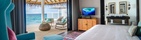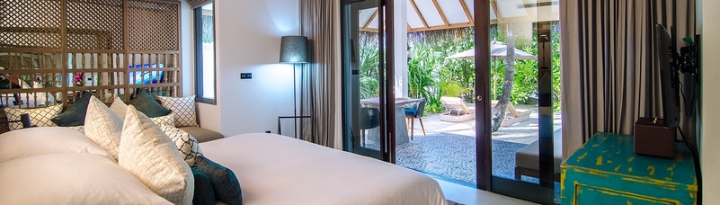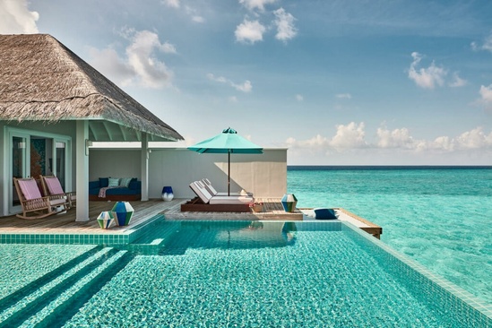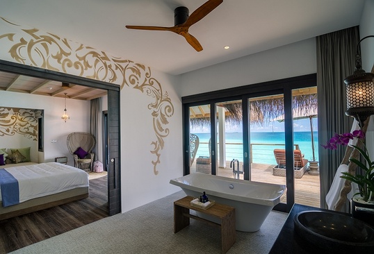 Rockstar 2-bedroom ocean pool villa: терраса с открытым персональным бассейном с пресной водой и обеденной зоной на открытом воздухе (стол на 6 персон), гостиная с обеденной зоной (стол на 6 персон), кухонный уголок, 2 спальни (каждая – с кроватью king-size), 2 ванные комнаты (каждая – с ванной, душевой кабиной и душем на открытом воздухе). Расположены на сваях над водой в конце пирса с водными виллами. Услуги персонального багги.