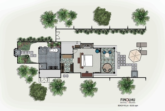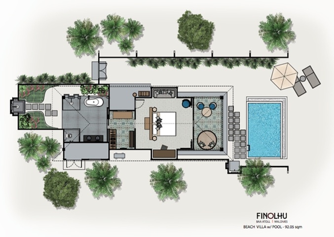 (205 кв. м): терраса с обеденной зоной на открытом воздухе (стол на 2 персоны), открытый персональный бассейн с пресной водой, спальня с кроватью king-size, гардеробная, ванная комната с ванной, душевой кабиной и душем на открытом воздухе. Расположены рядом с пляжем среди садов.
