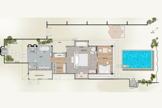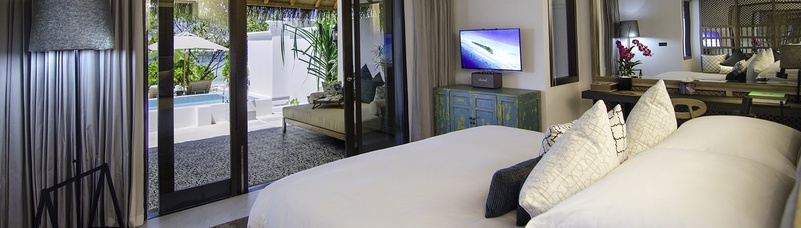 Beach pool villa : терраса с открытым персональным бассейном, спальня с кроватью king-size, ванная комната с ванной и душевой кабиной, душ на открытом воздухе c функцией «тропический дождь». Расположены рядом с пляжем среди садов. Вид на лагуну.