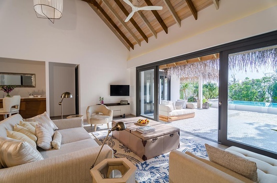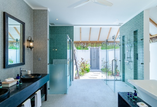(460 кв. м): терраса с открытым персональным бассейном с пресной водой и обеденной зоной на открытом воздухе (стол на 6 персон), гостиная с обеденной зоной (стол на 6 персон), 2 спальни (каждая – с кроватью king-size), 2 ванные комнаты (каждая – с ванной, душевой кабиной и душем на открытом воздухе). Расположены на сваях над водой.