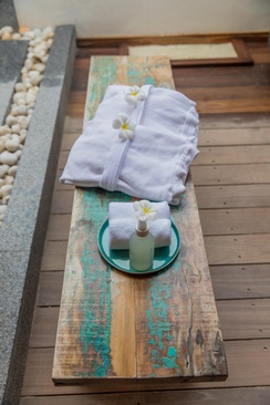 зона отдыха с роскошной ванной и душем, феном, защитными куртками, пляжными полотенцами
