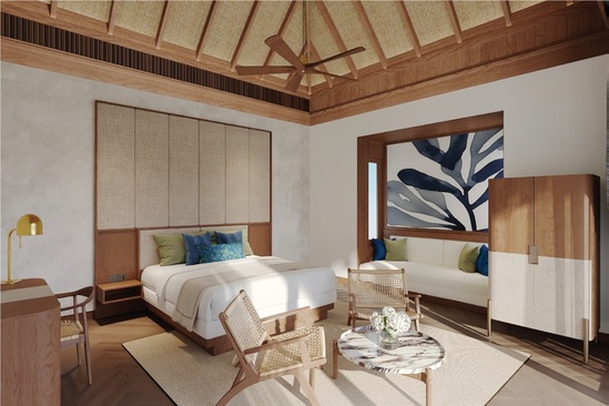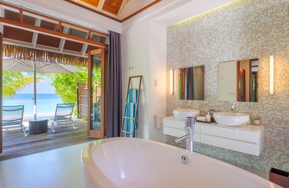 Виллы расположены на сваях над водой. В просторной спальне находится кровать king size и зона отдыха с видом на океан. В ванной комнате, обращенной к лагуне, есть джакузи, душ, две раковины. На террасе гостей ждут лежаки под зонтиком и спуск в океан. Категория перестанет существовать с августа 2025.