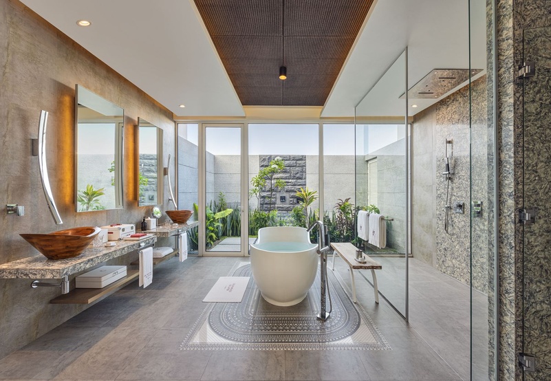 трехуровневый номер. Терраса на крыше, терраса с открытым персональным бассейном и обеденной зоной на открытом воздухе, гостиная, 3 спальни, 3 гардеробные, сауна, парная, зона для фитнеса, 3 ванные комнаты. Расположены на сваях над водой.