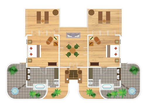 Beach Villa Suite - две соединенные Beach Villa (без смежной двери) с общей зоной для отдыха под открытым небом. Состоят из спальни с кроватью king-size, спальни с двумя кроватями twin, 2 ванных комнат с отдельной ванной и открытым душем, террасы с лежаками, качелями и выходом на пляж.