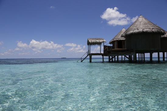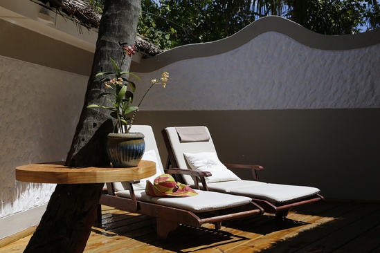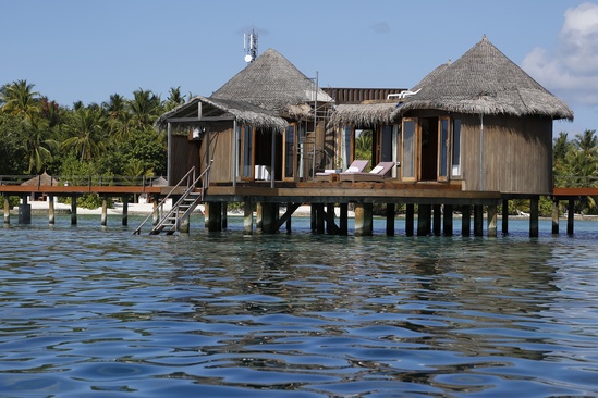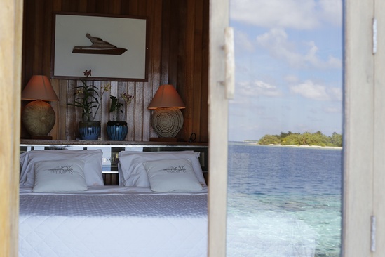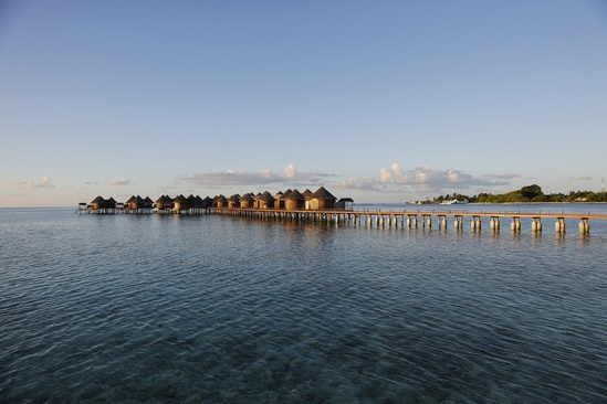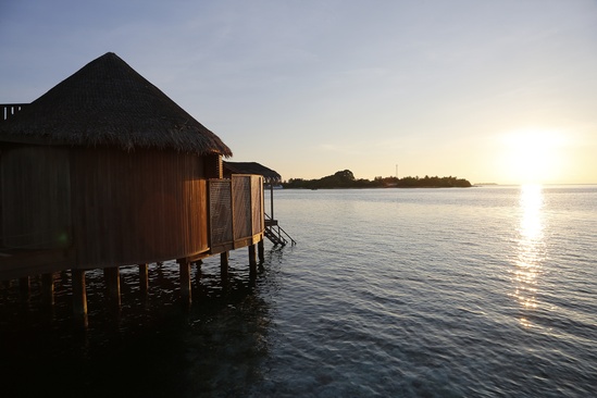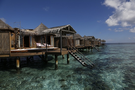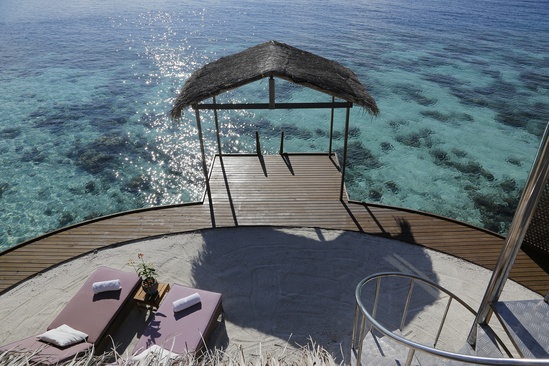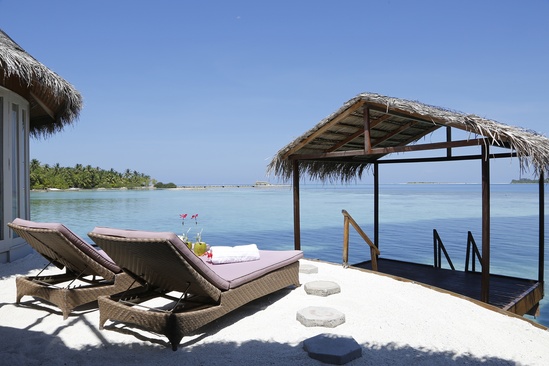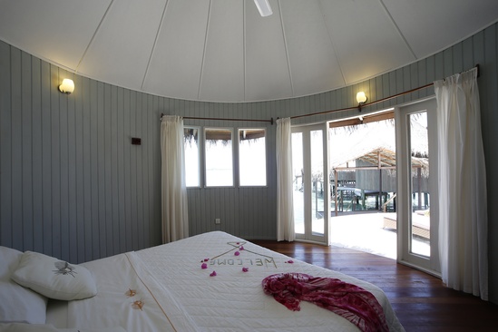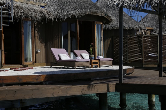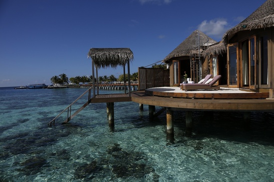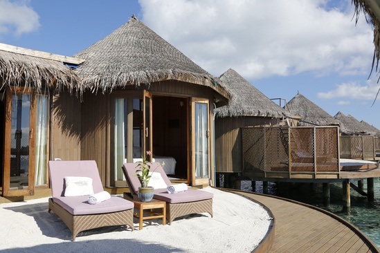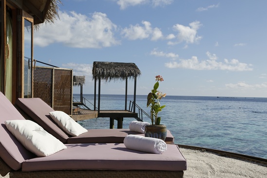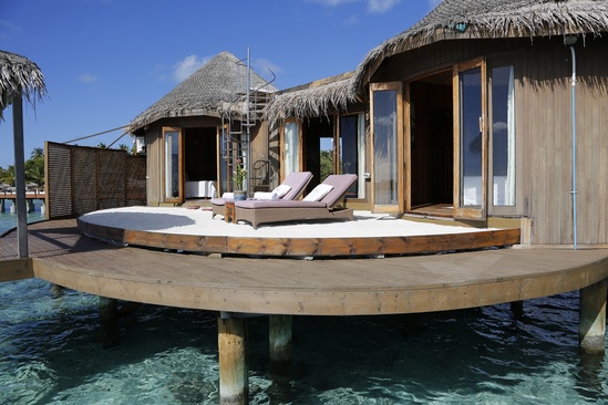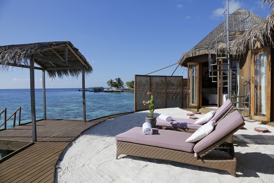 водные бунгало, состоящие из спальни и гостиной, с трехуровневой террасой: 1-й уровень – крыша “sun deck”, 2-й уровень – маленький пляж с шезлонгами, 3-й уровень – спуск в воду по лестнице. Максимальное размещение - 3 взрослых или 2 взрослых и 1 ребенок.