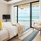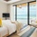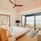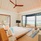 Sunset beach villa with jacuzz в номере: терраса, спальня с кроватью king-size, ванная комната с душем, джакузи и душ на открытом воздухе. Расположены рядом с пляжем. Вид на закат.