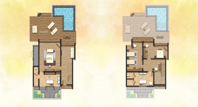 4 Two-Bedroom Family Beach Villa with Private Pool (355 кв.м.) двухэтажные виллы на берегу, на первом этаже – спальня с зоной отдыха, ванная комната открытой планировки, терраса с зоной отдыха, бассейном и выходом на пляж. На втором этаже расположена вторая спальня и ванная комната.