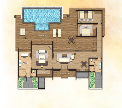 2 Three- Bedroom Beach Suite Villa with Private Pool (410 кв.м.) люкс на берегу с тремя спальнями, гостиной, большой террасой с зоной отдыха, бассейном и выходом на пляж.