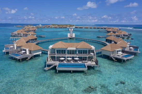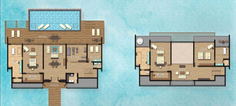 3 Bedroom Overwater Royal Residence (790 кв.м.) роскошный двухэтажный президентский люкс над водой с тремя спальнями, гостиной с обеденной зоной, тренажерным залом, небольшой кухней, комнатой для спа-процедур и большой террасой с зоной отдыха, бассейном и спуском в лагуну.