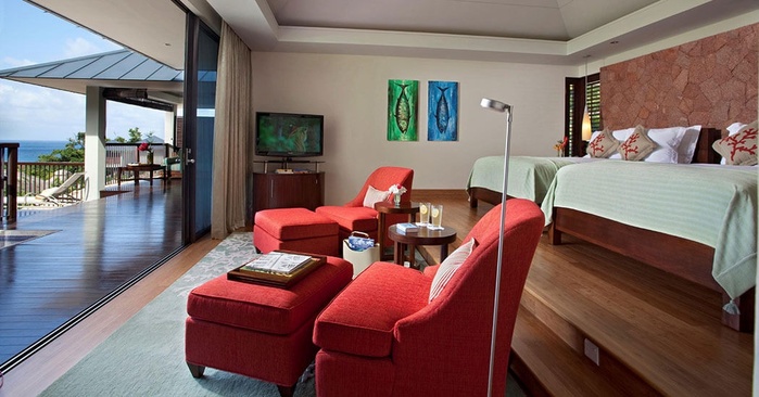 Panoramic pool villa (135 кв. м): балкон с открытым персональным бассейном, обеденный павильон на открытом воздухе, спальня с кроватью king-size или двумя кроватями queen-size, гардеробная, ванная комната с ванной и душем, душ с функцией «тропический дождь» на открытом воздухе. Расположены на возвышенности. Вид на океан и острова.