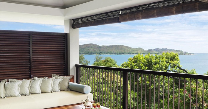 Ocean view pool villa (125-135 кв. м): балкон с открытым персональным бассейном, обеденный павильон на открытом воздухе и зона для барбекю, кухонная зона, спальня с кроватью king-size или queen-size, гардеробная, ванная комната с ванной и душем, душ с функцией «тропический дождь» на открытом воздухе. Вид на океан и остров Curieuse.