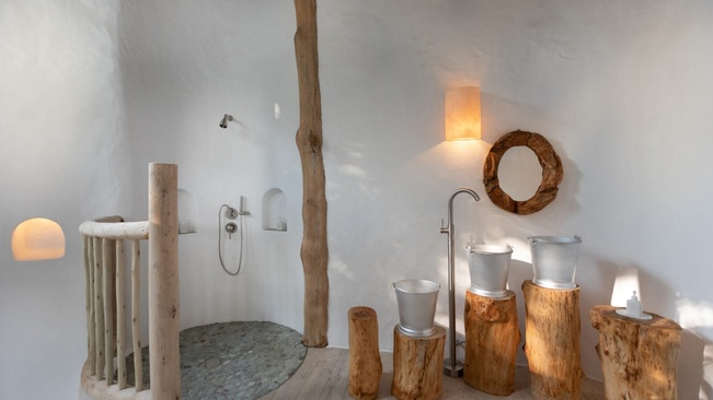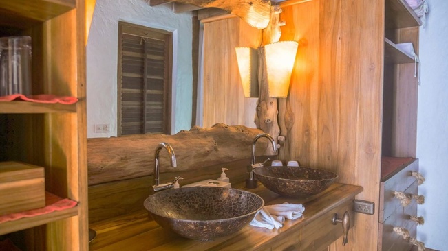 Crusoe Suite with Pool двухэтажные виллы с бассейном. На первом этаже: гостиная, терраса с качелями и обеденной зоной, мини-бар (в отдельной комнатке), гардеробная, ванная комната с закрытой и открытой зонами. На втором этаже: спальня и балкон с зоной отдыха. Перед виллой расположен свой садик с приватным бассейном, лежаками и выходом на пляж.
