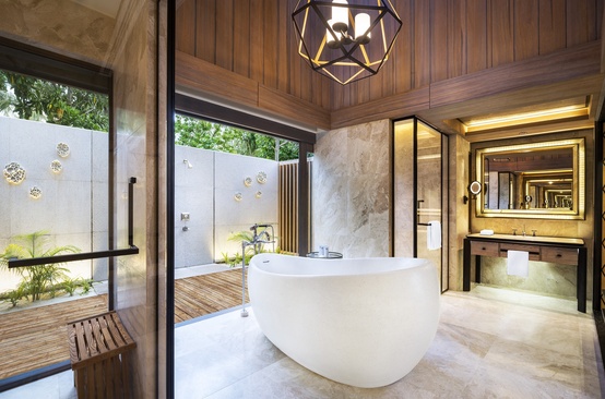двухэтажная вилла. Терраса с открытым персональным бассейном (15 кв. м) и обеденной зоной на открытом воздухе (стол на 4 персоны), балкон, 2 спальни (одна – с кроватью king-size и гостиной зоной, другая – с двумя отдельными кроватями), 2 ванные комнаты. Часть номеров расположена на берегу, часть – на сваях над водой.