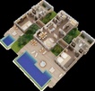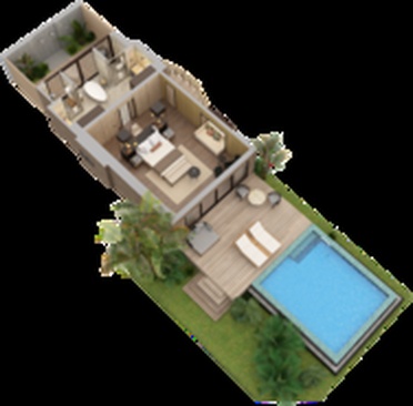 двухэтажная вилла. Терраса с открытым персональным бассейном (67 кв. м), балкон, гостиная, кухня, обеденная зона (стол на 6 персон), 2 спальни, 2 гардеробные, 2 ванные комнаты, душ под открытым небом. Расположены на берегу. Имеют прямой выход на пляж. Вид на океан.