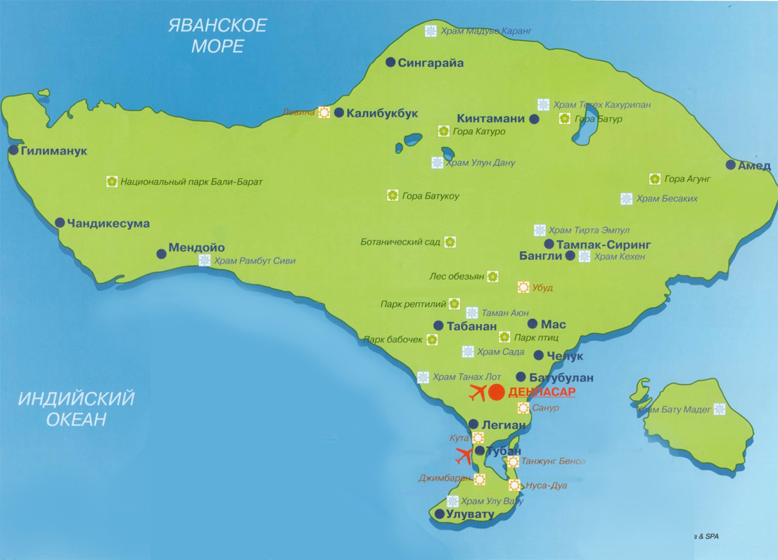 - Южный — Nusa Dua, Kuta, Sanur, Seminyak, Jimbaran, Changu;